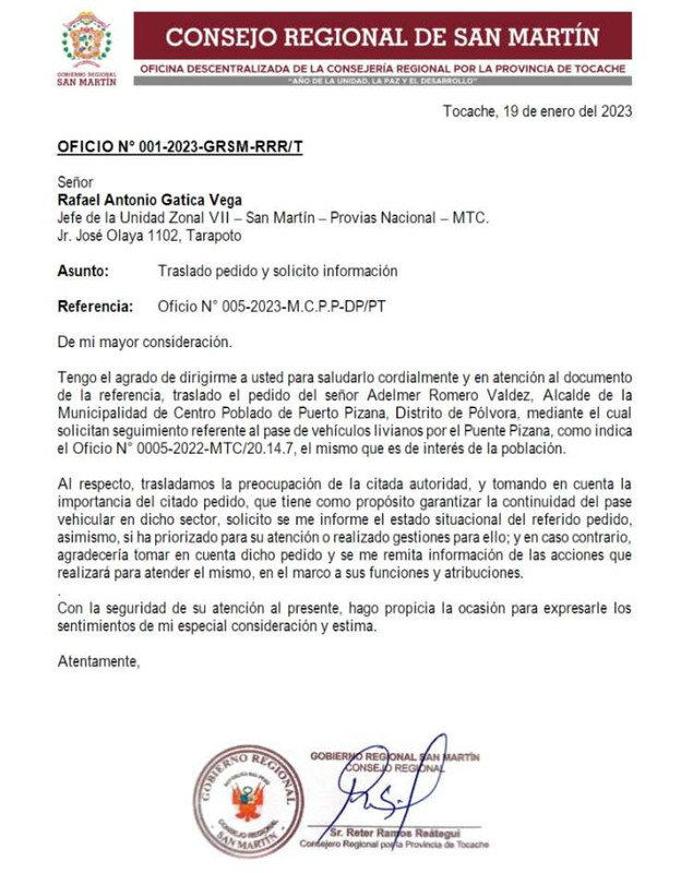¡Urgente! atención al Puente Pizana, es el reclamo del alcalde del Distrito de Pólvora, provincia de Tocache, la autoridad dijo que existiría desinterés de parte del Ministerio de Transporte y Comunicaciones, Provias Nacional y del Jefe Zonal San Martín, Rafael Antonio Gatica Vega, para dar solución a un serio problema que está a punto de generar enfrentamiento entre las poblaciones que se ubican en esa zona de la región San Martín.